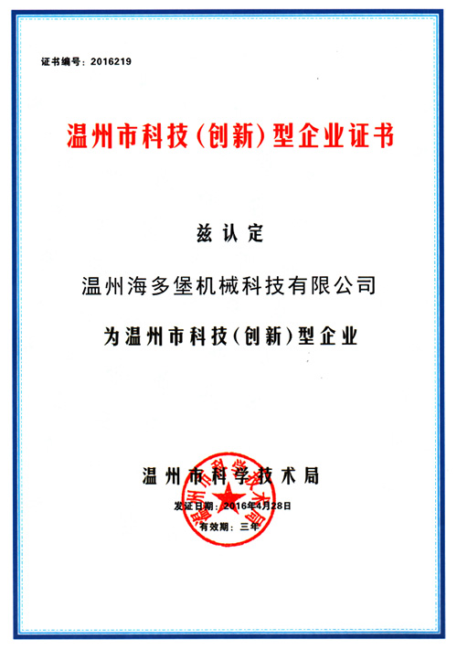 溫州海多堡機械科技,于2016年被認(rèn)定為溫州市科技(創(chuàng)新)型企業(yè),同時授予溫州市科技(創(chuàng)新)型企業(yè)證書。